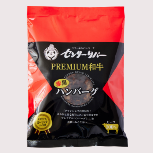 あか牛と黒毛和牛をブレンドした国産牛肉100%のプレミアムハンバーグ。
